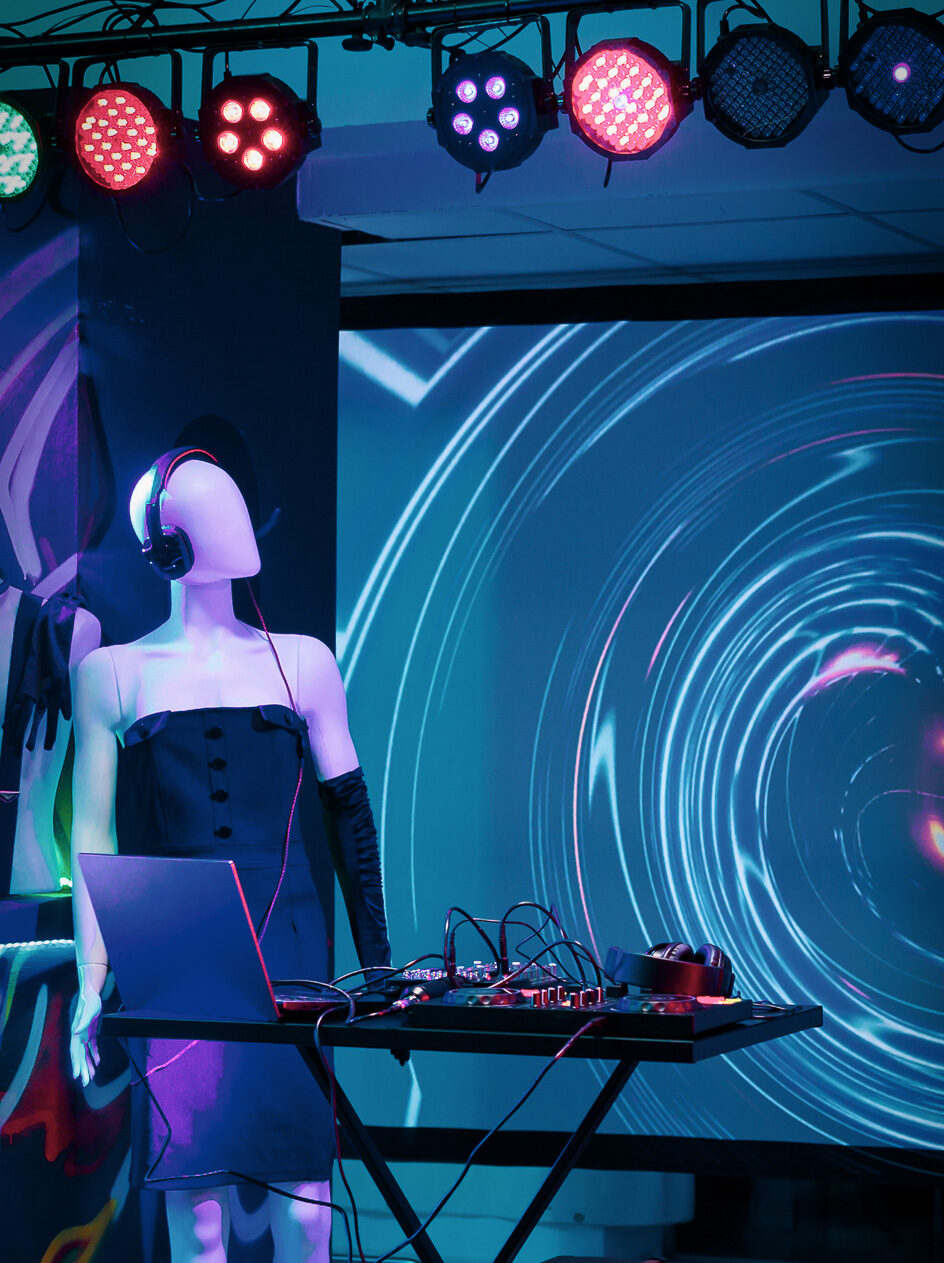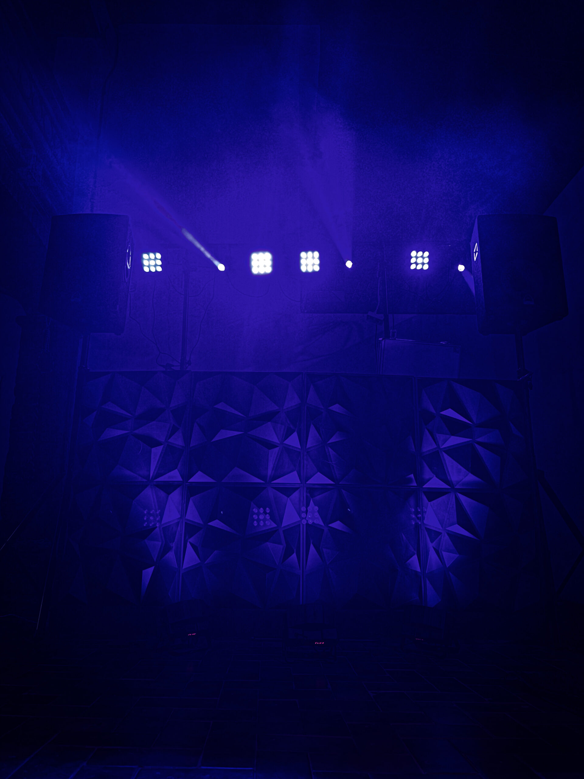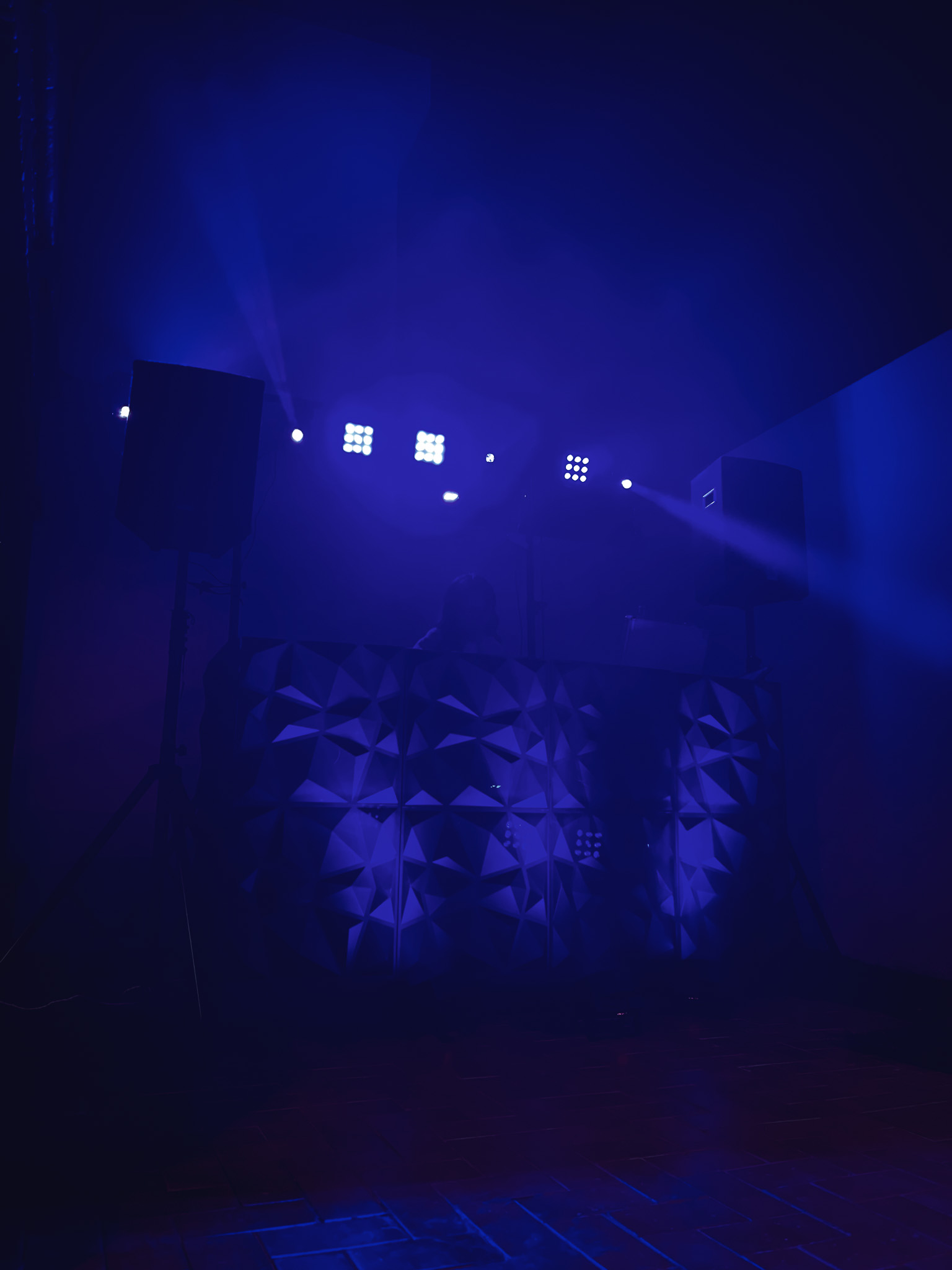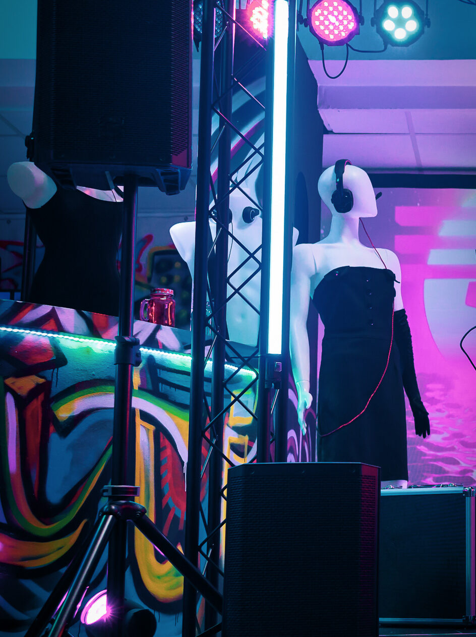 Dj equipment on stage for electronic music live performance in nightclub. Musician controller for sound mixing, speakers and spotlights for party discotheque in club with no people