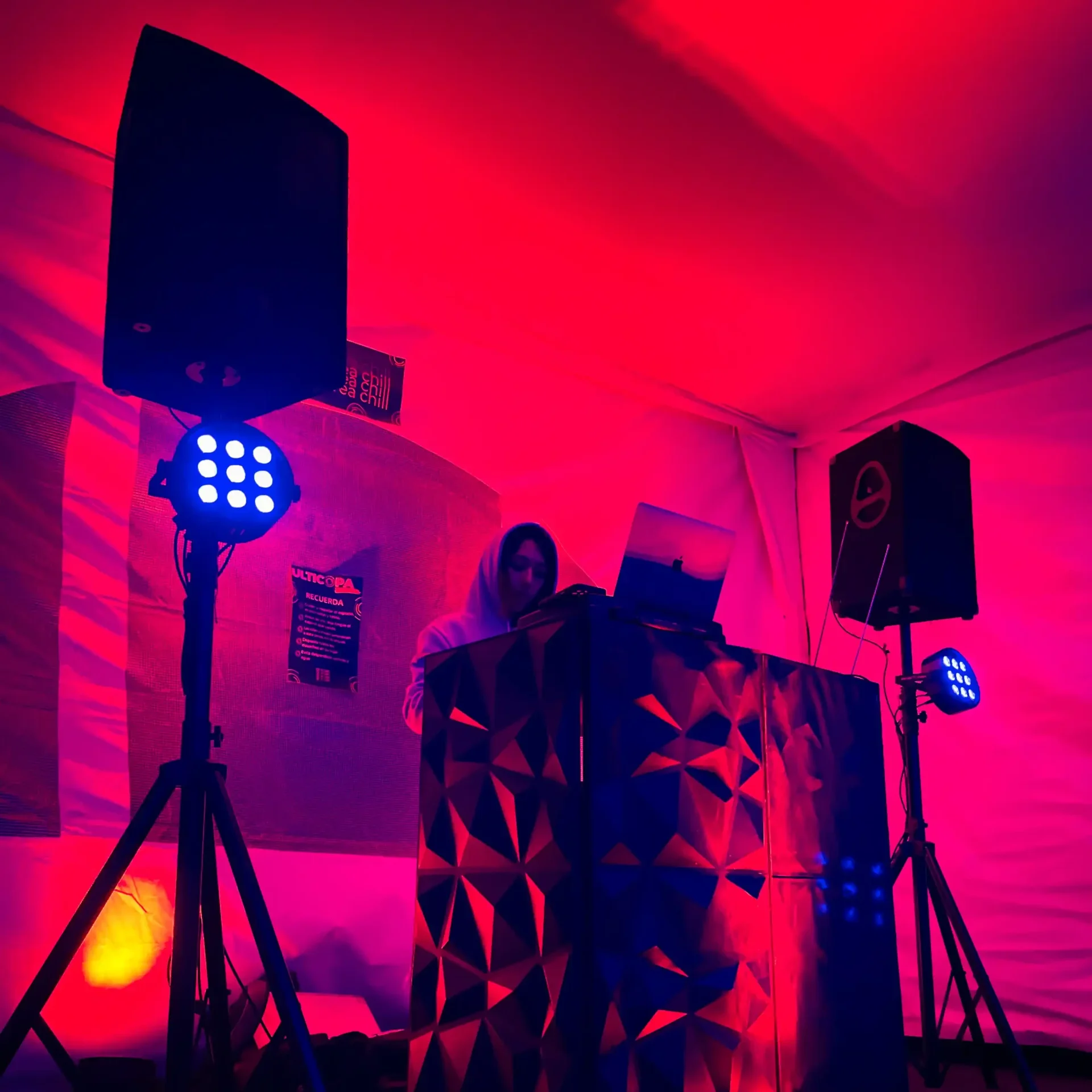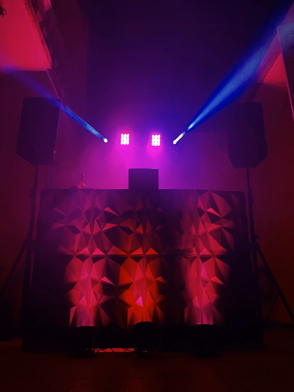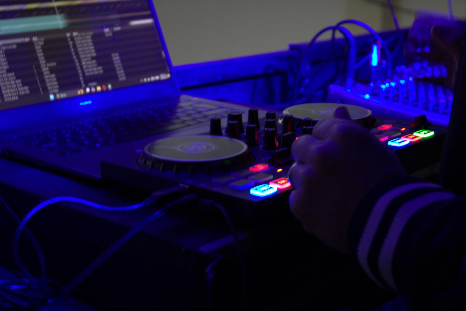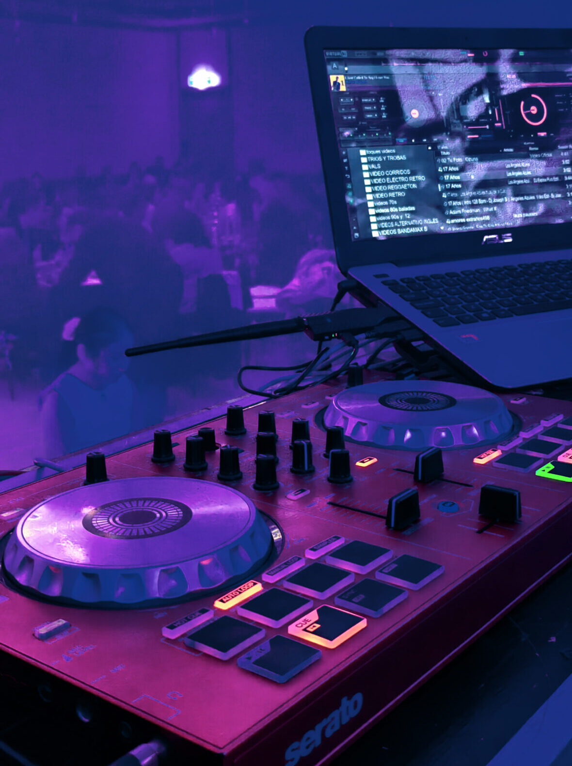 Dj equipment on stage for electronic music live performance in nightclub. Musician controller for sound mixing, speakers and spotlights for party discotheque in club with no people