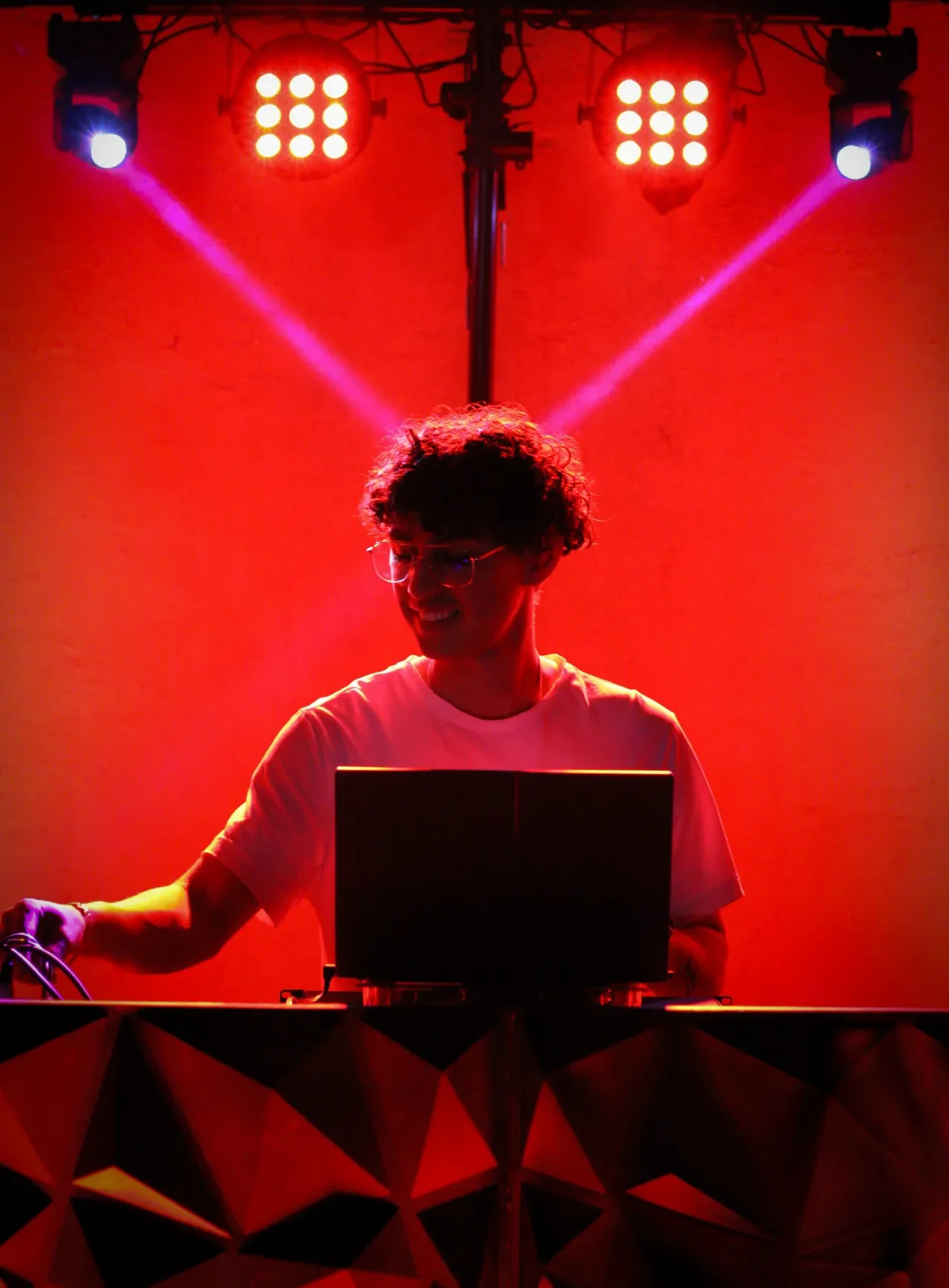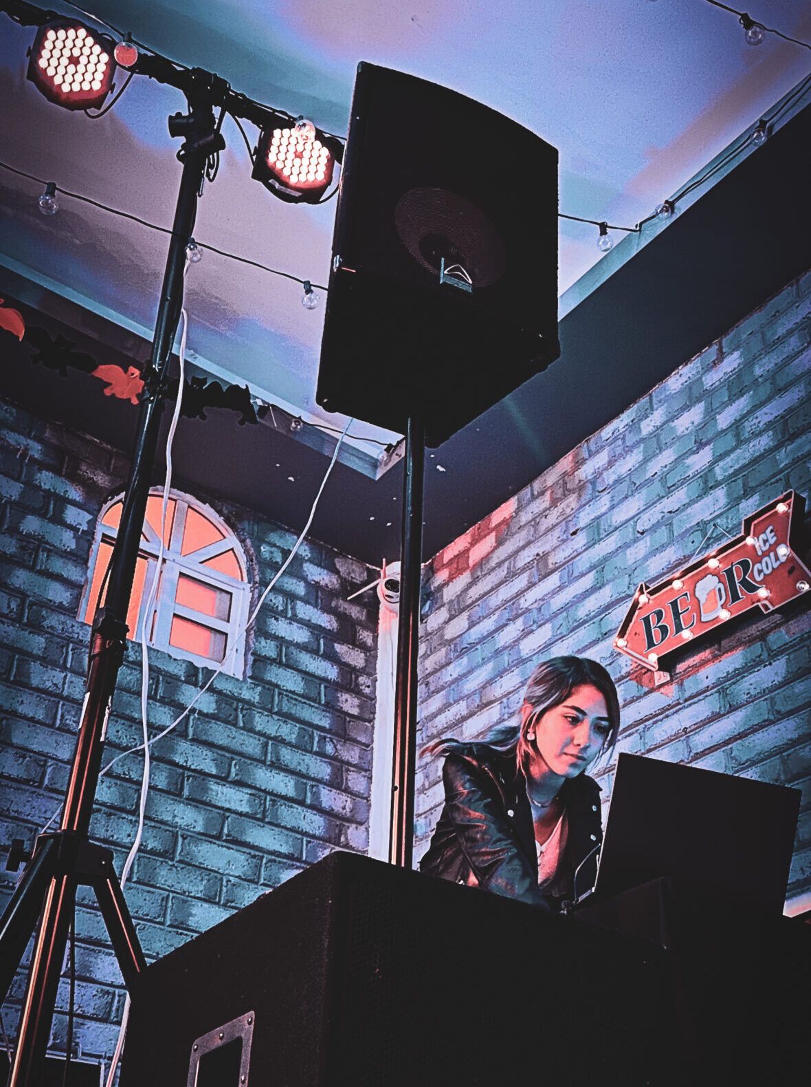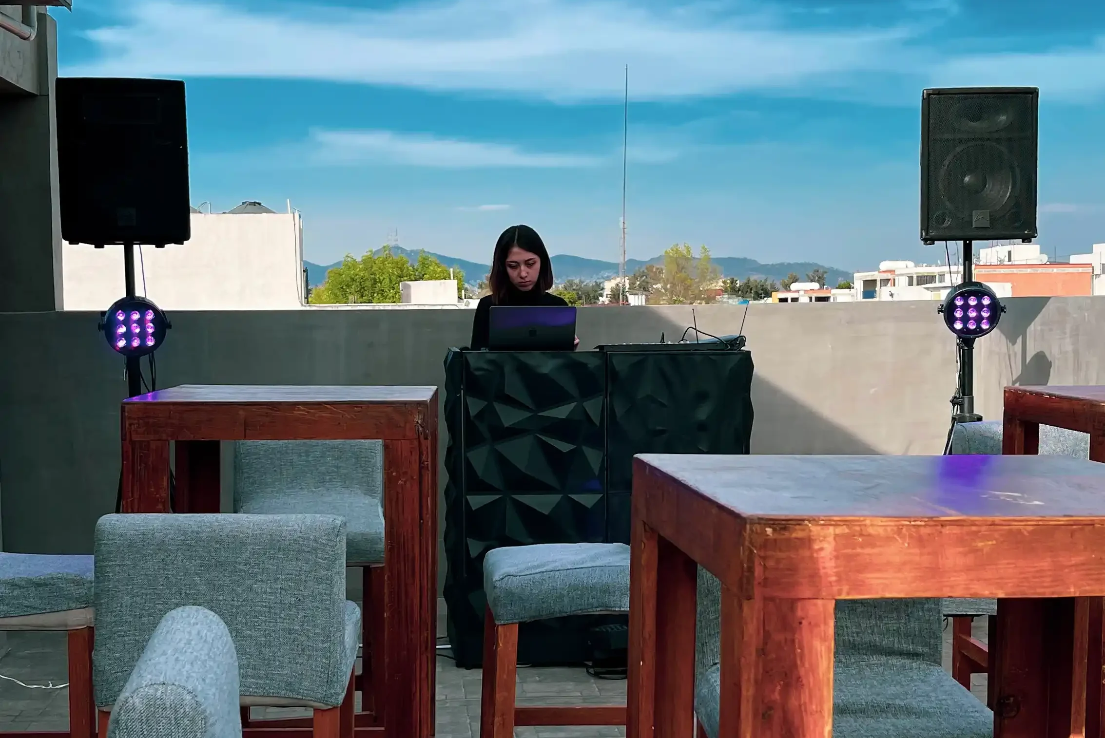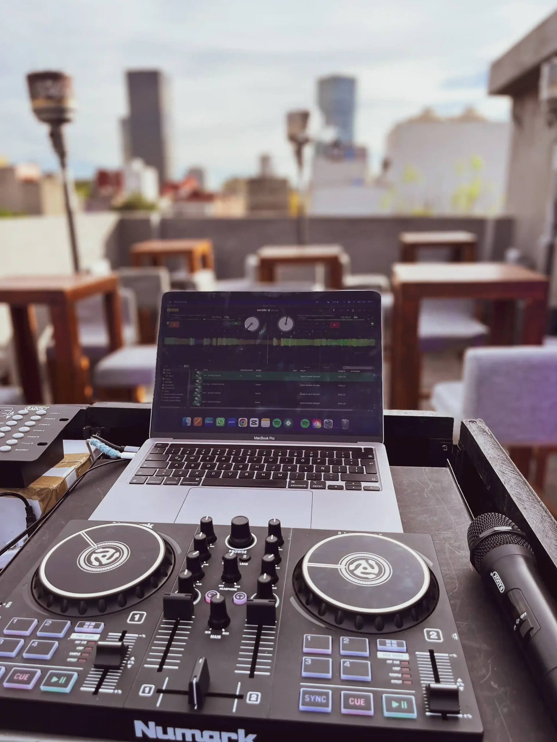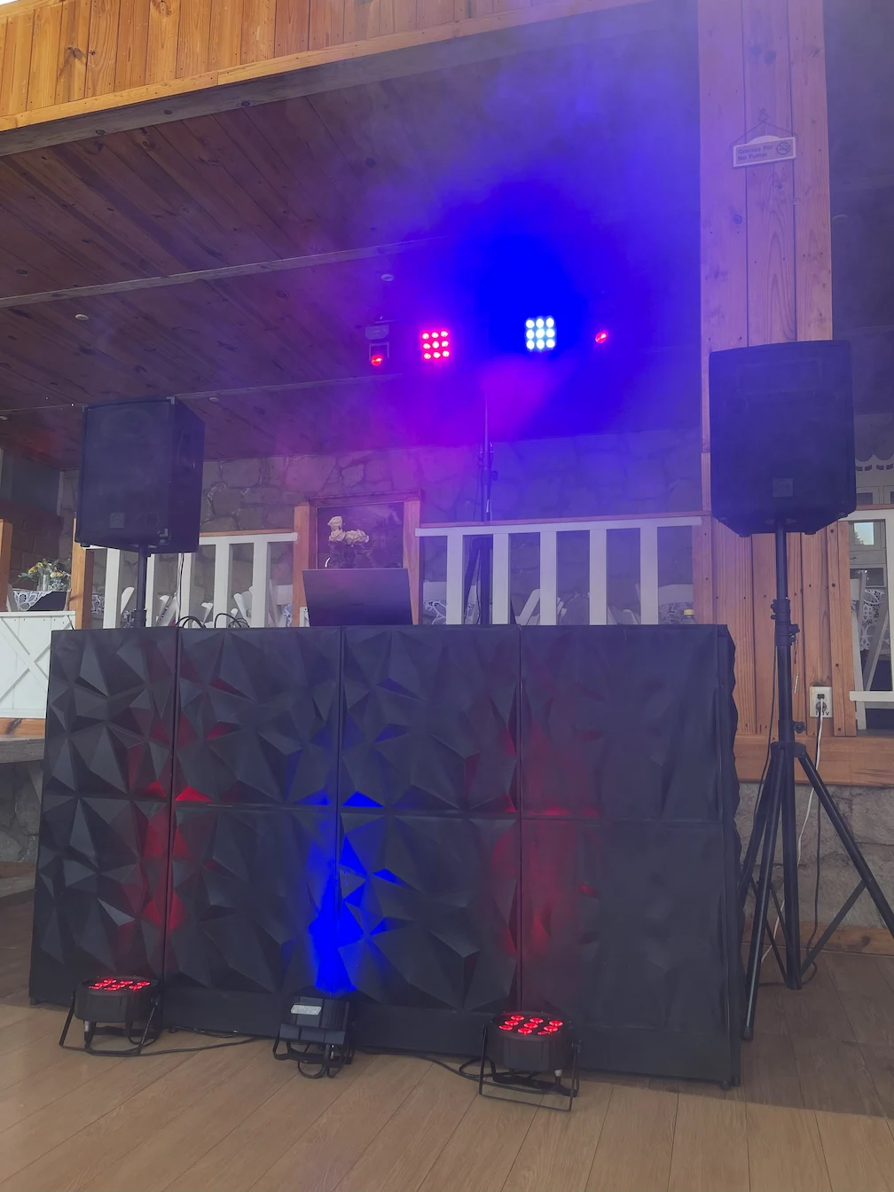 Dj equipment on stage for electronic music live performance in nightclub. Musician controller for sound mixing, speakers and spotlights for party discotheque in club with no people