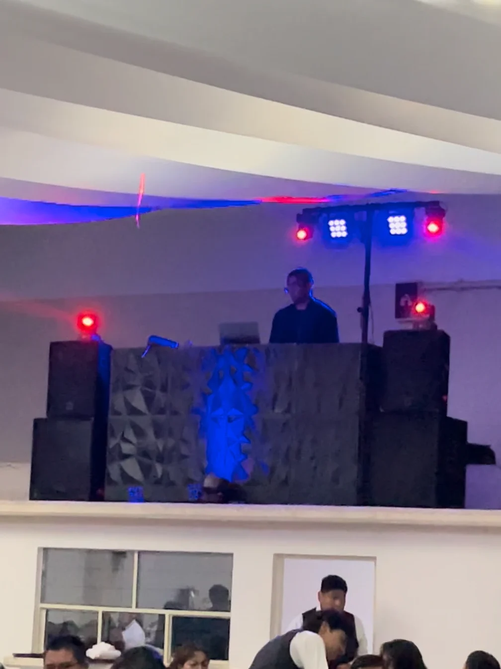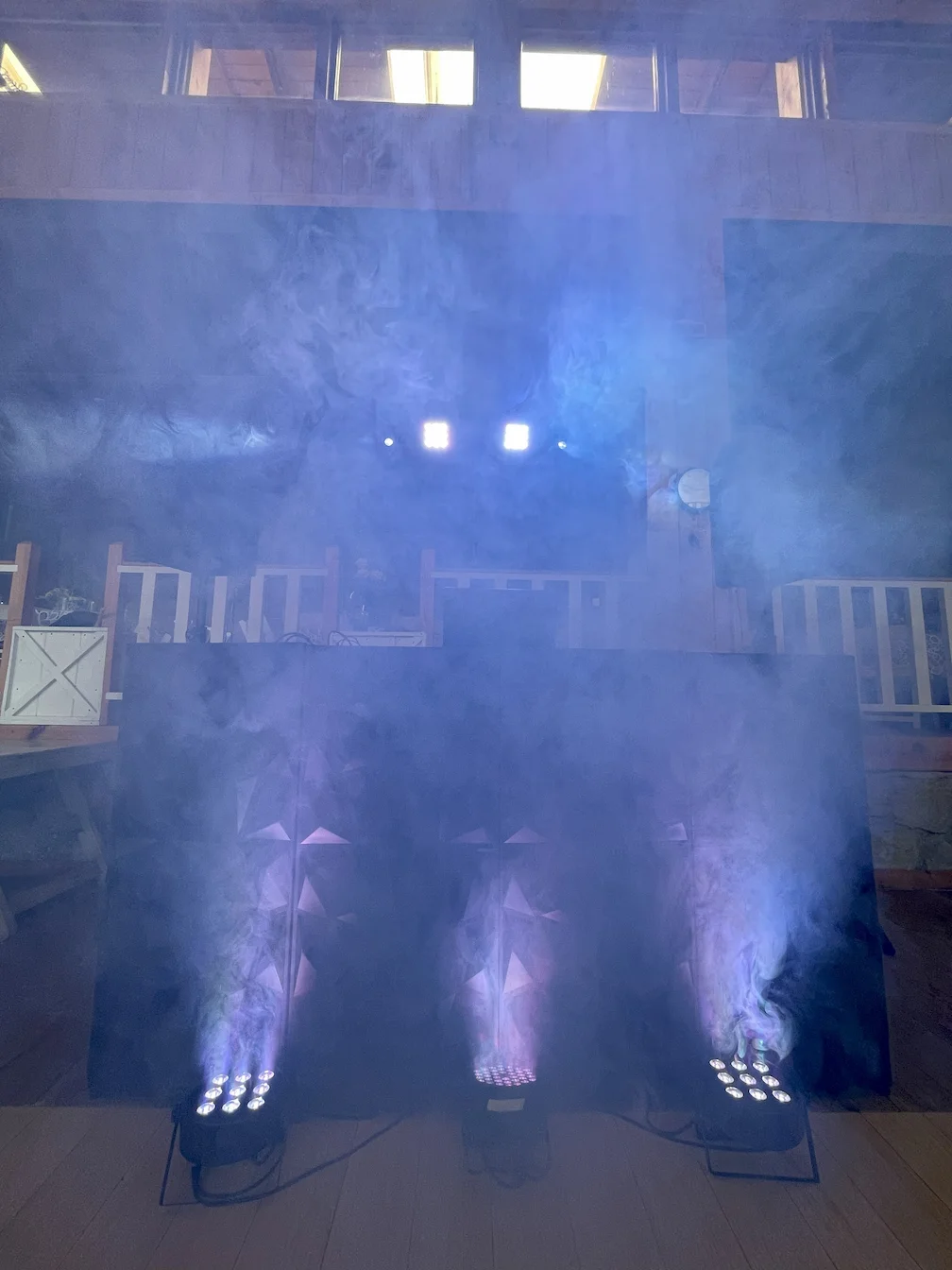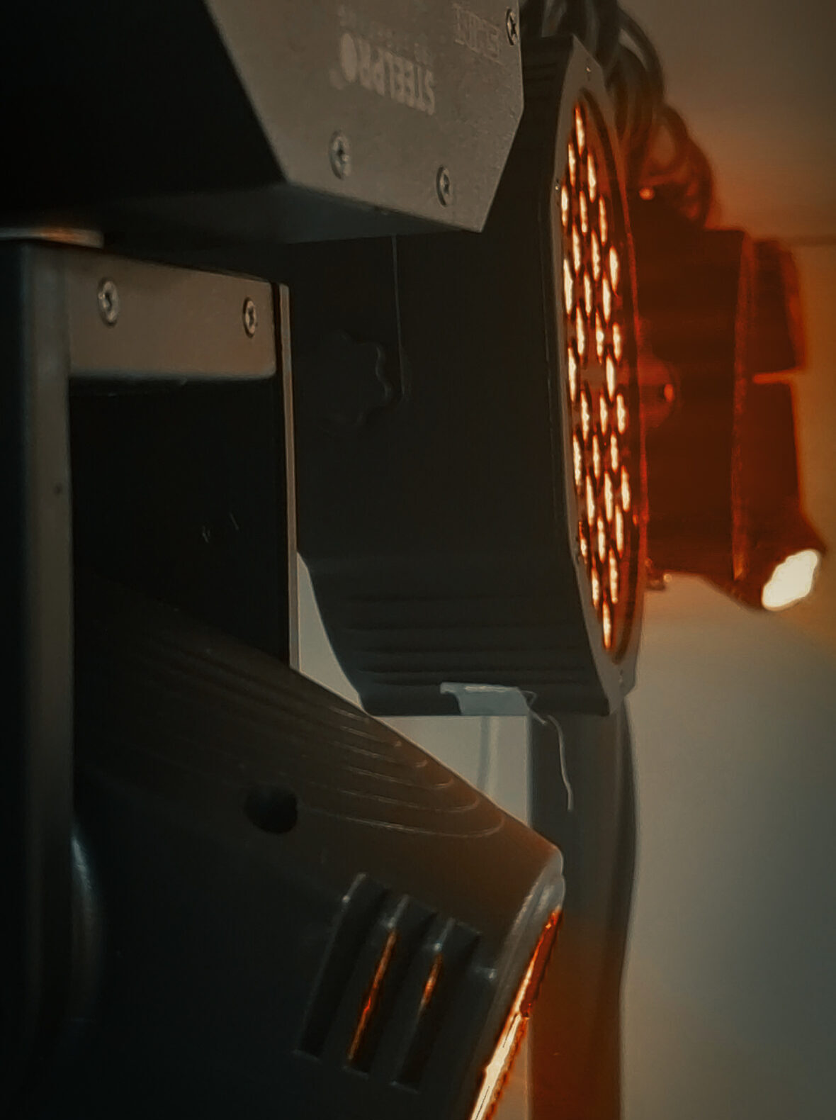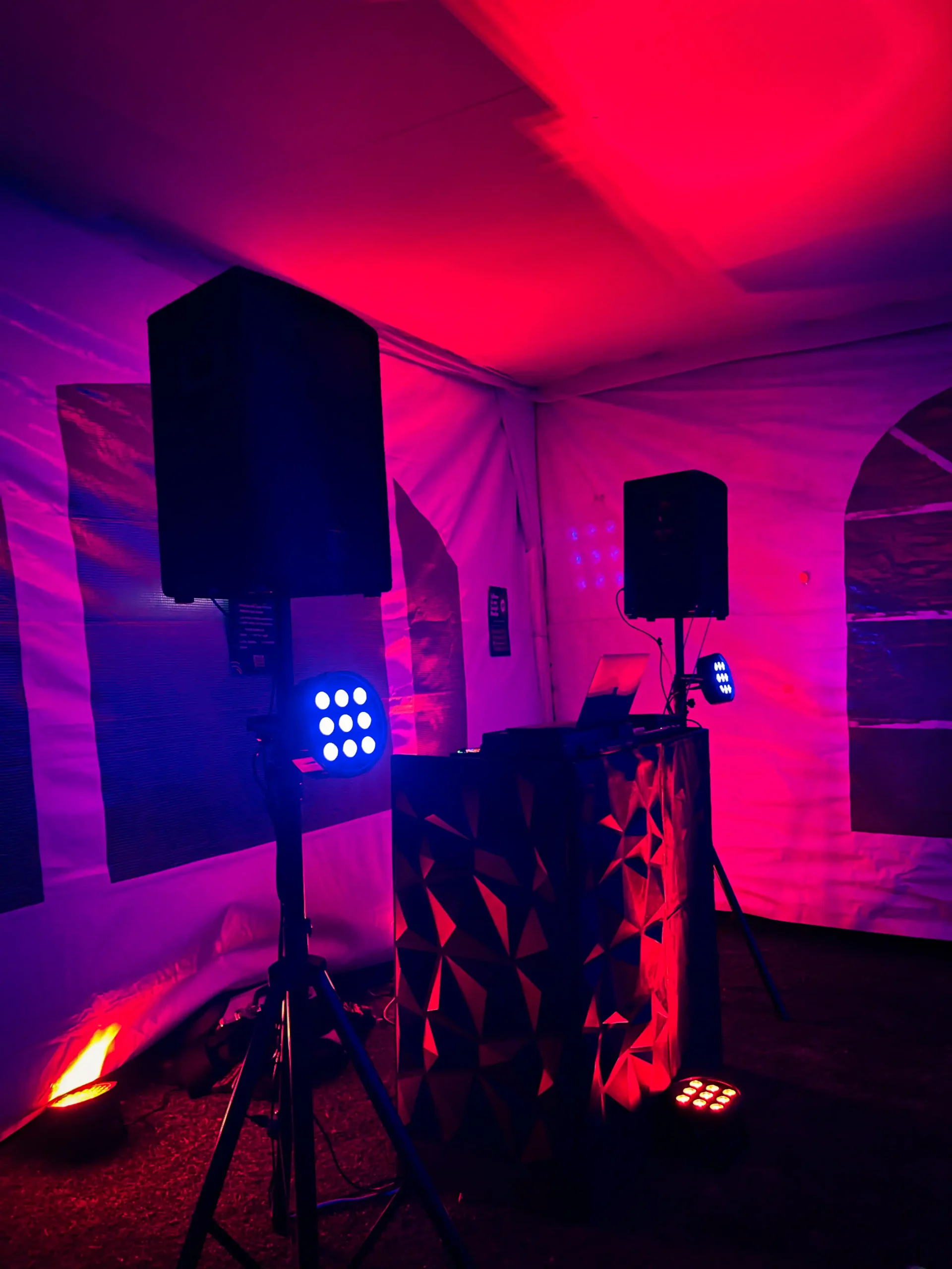 Dj equipment on stage for electronic music live performance in nightclub. Musician controller for sound mixing, speakers and spotlights for party discotheque in club with no people