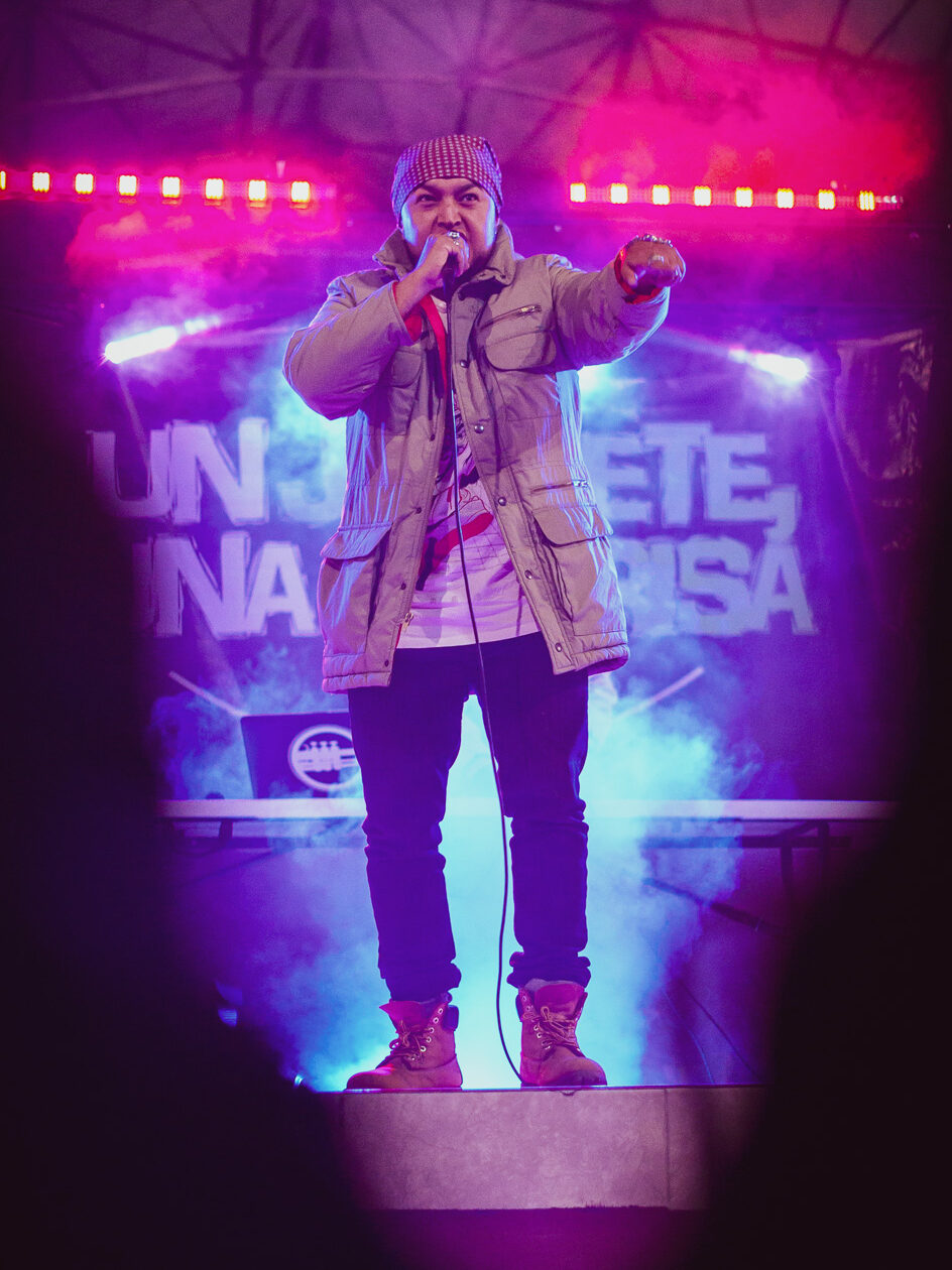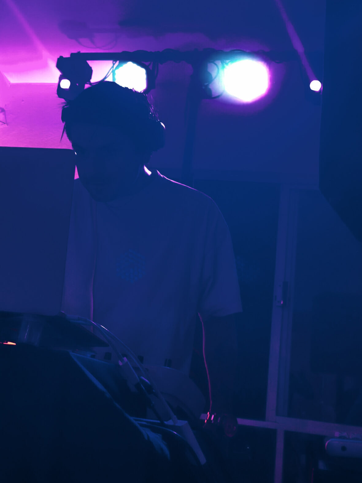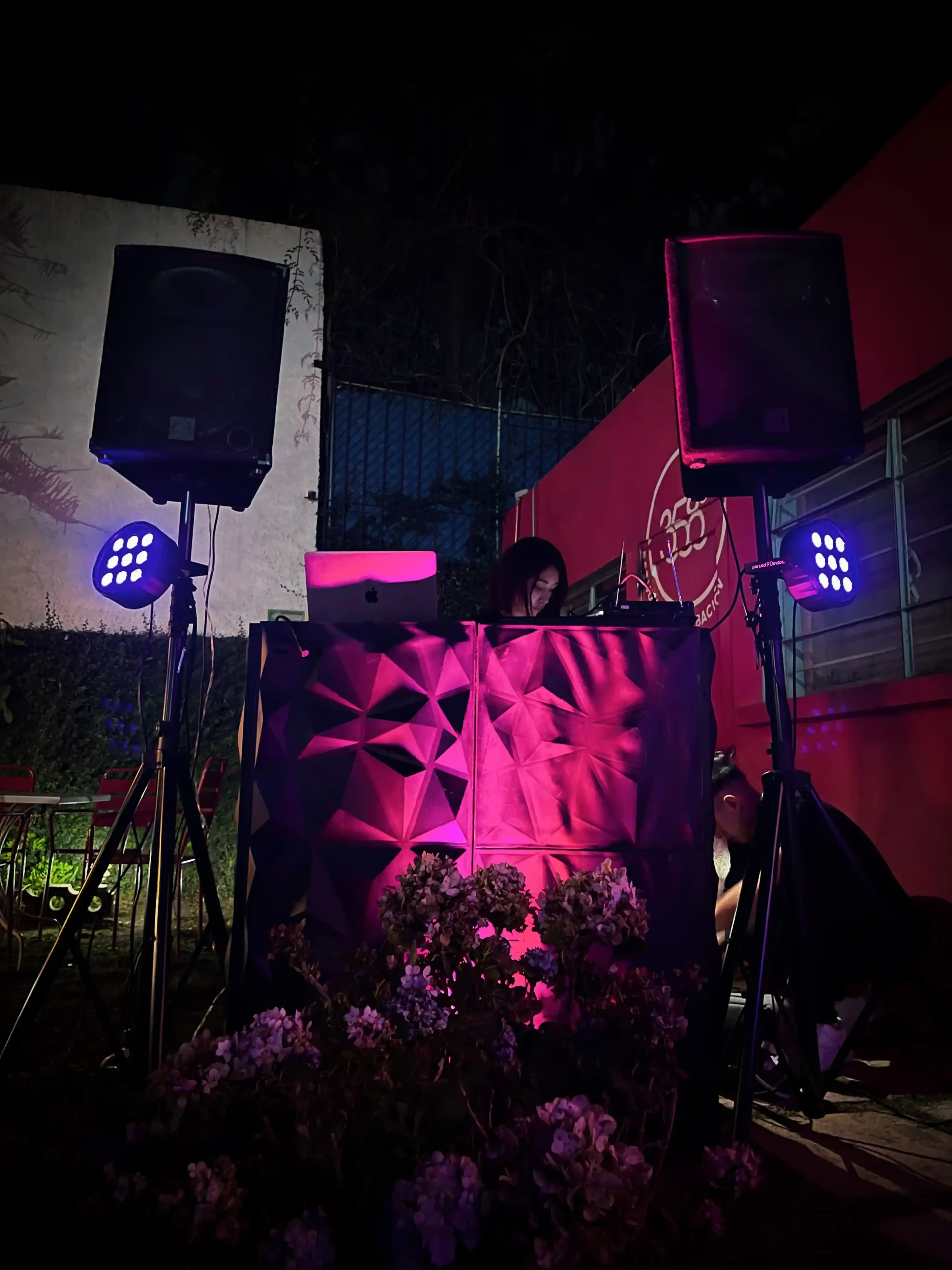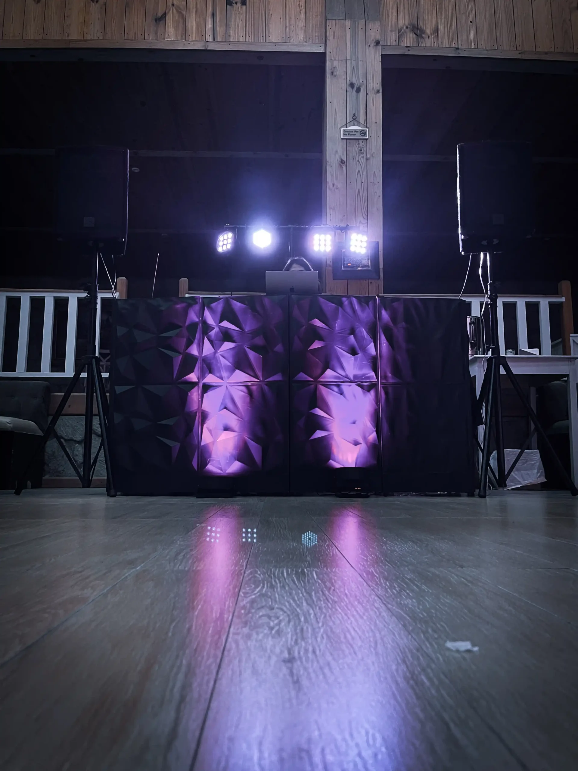 Dj equipment on stage for electronic music live performance in nightclub. Musician controller for sound mixing, speakers and spotlights for party discotheque in club with no people