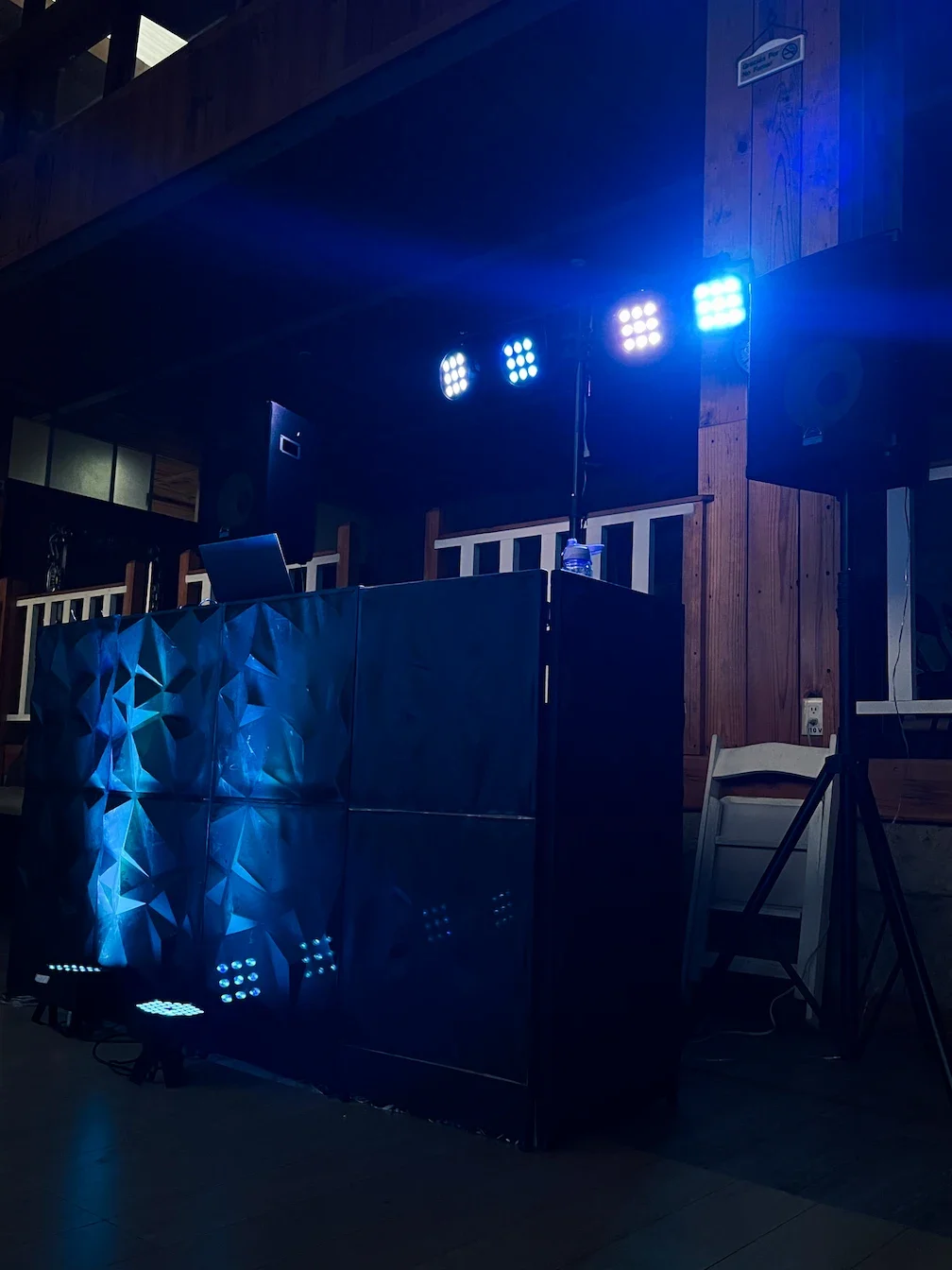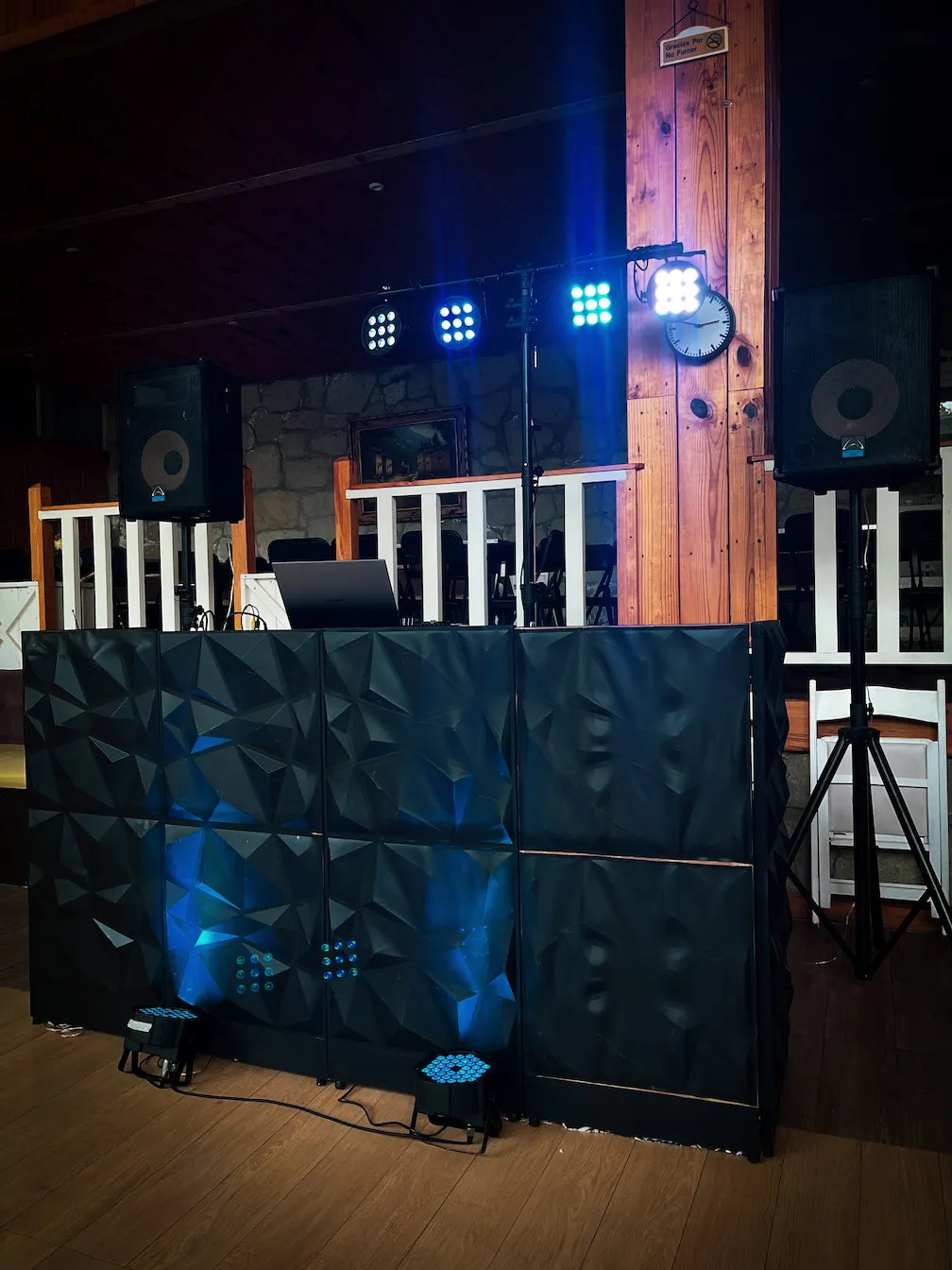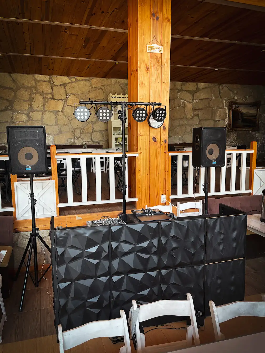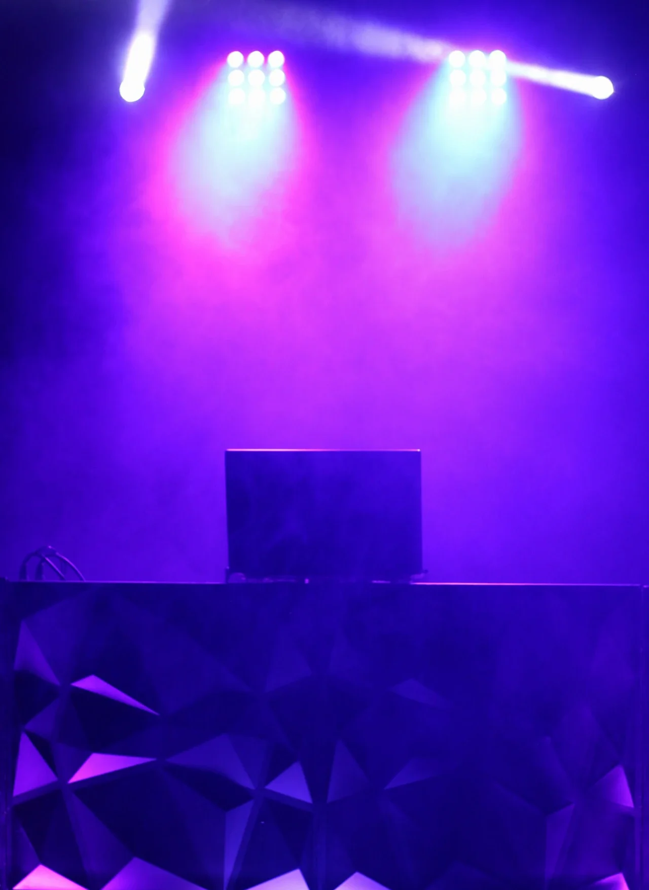 Dj controller on stage for discotheque in empty nightclub with no people. Electronic musician console equipment, loudspeakers and spotlights for live music concert in dark club.