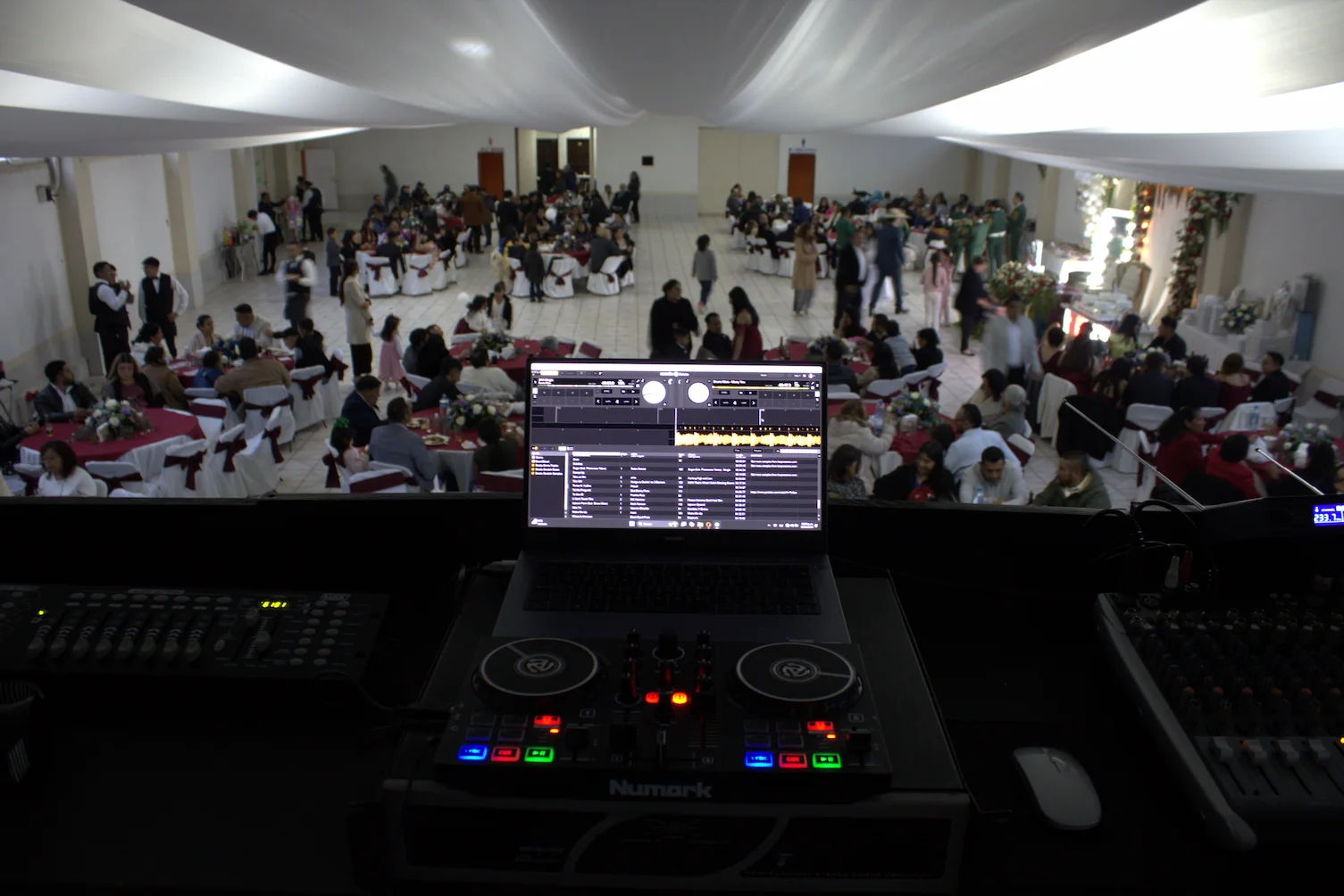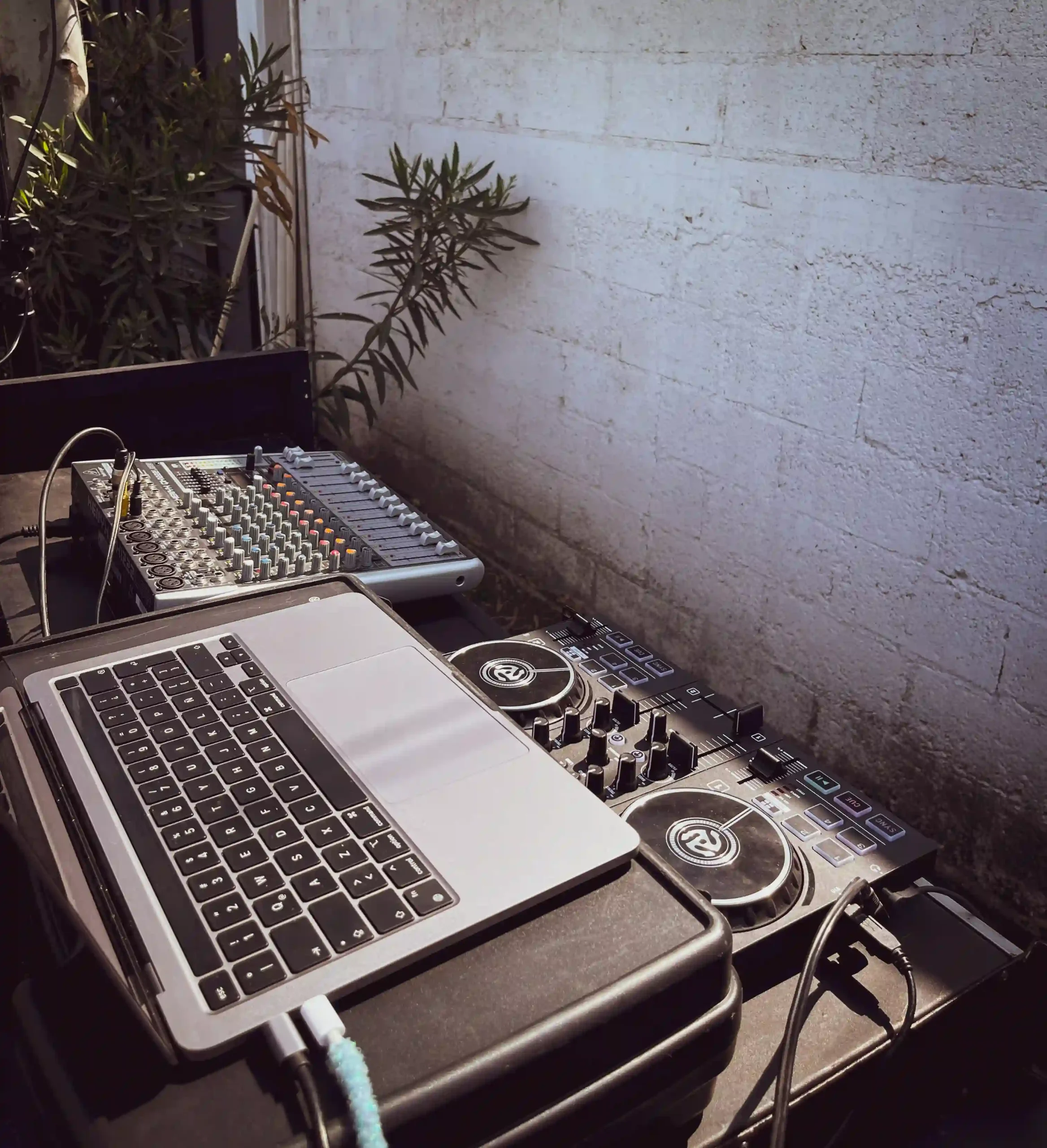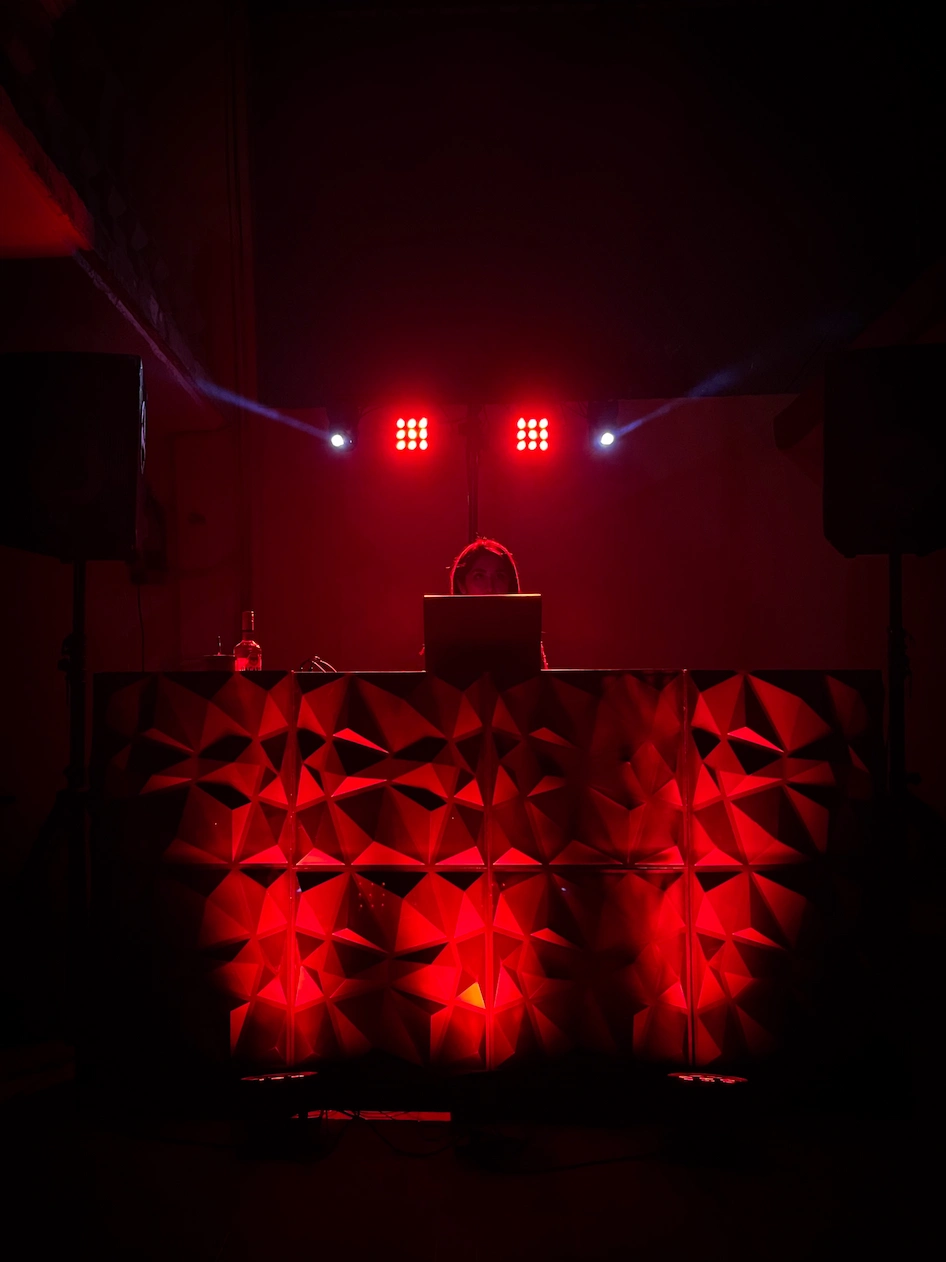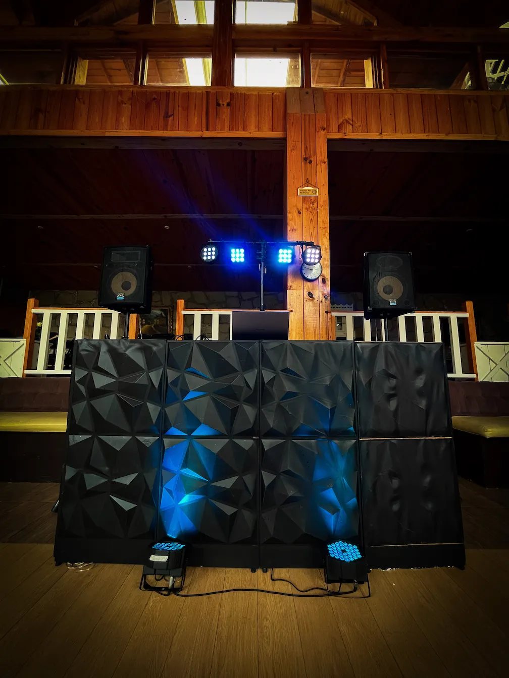 Dj controller on stage for discotheque in empty nightclub with no people. Electronic musician console equipment, loudspeakers and spotlights for live music concert in dark club.