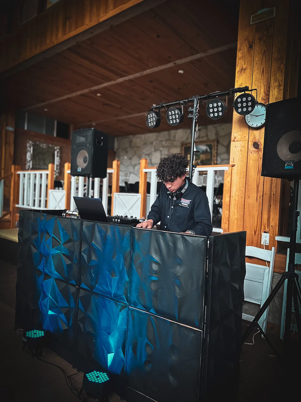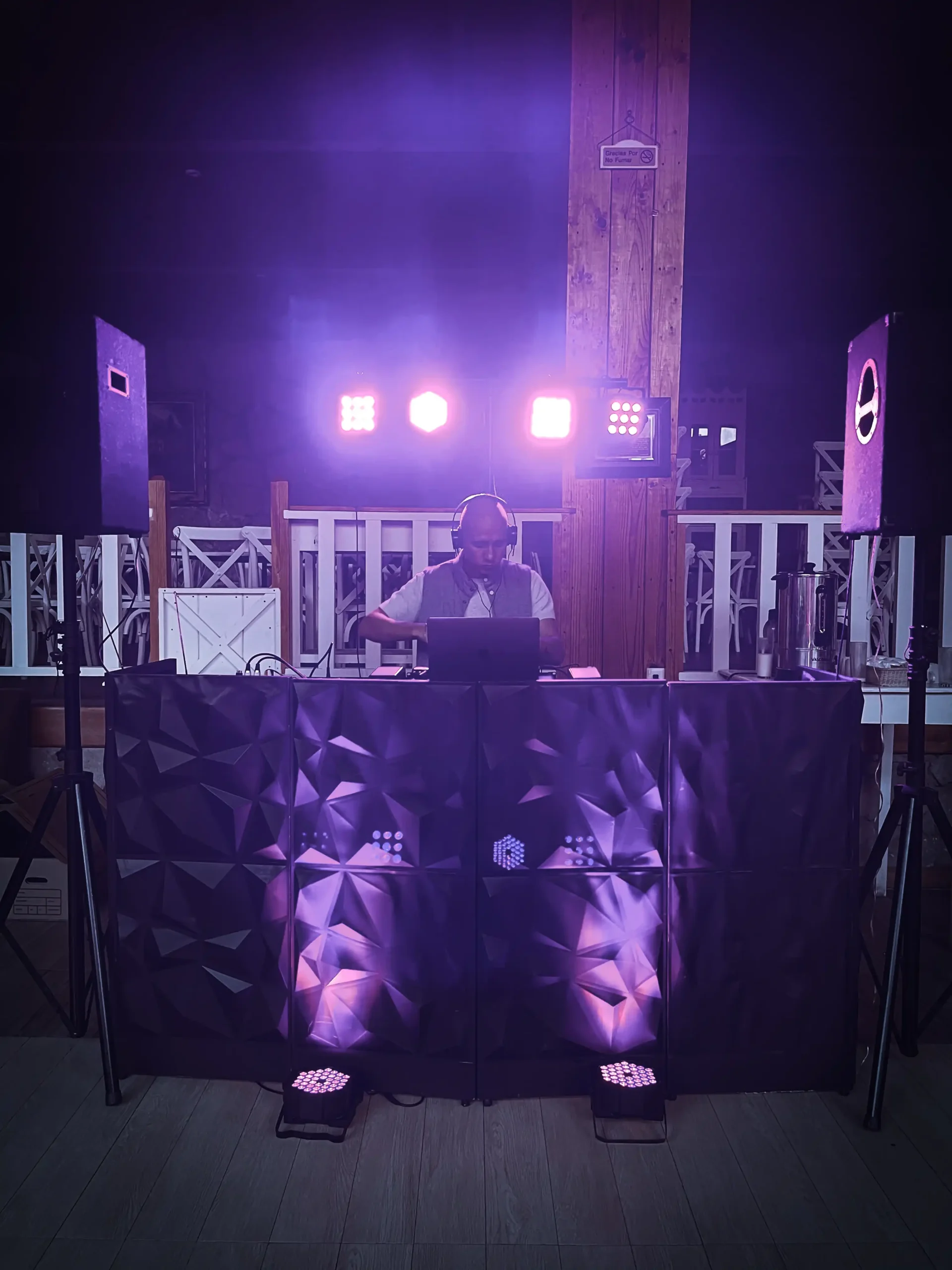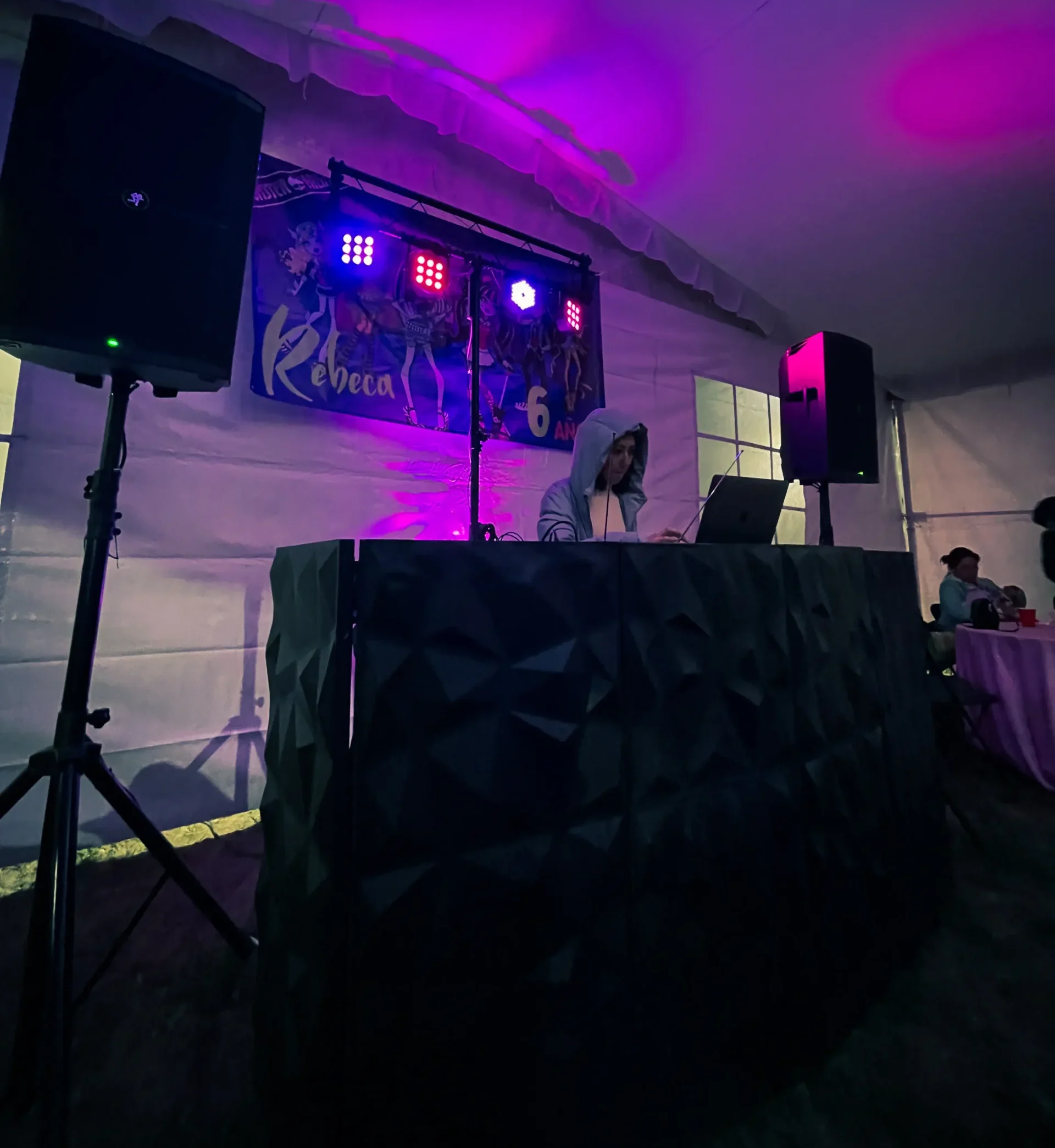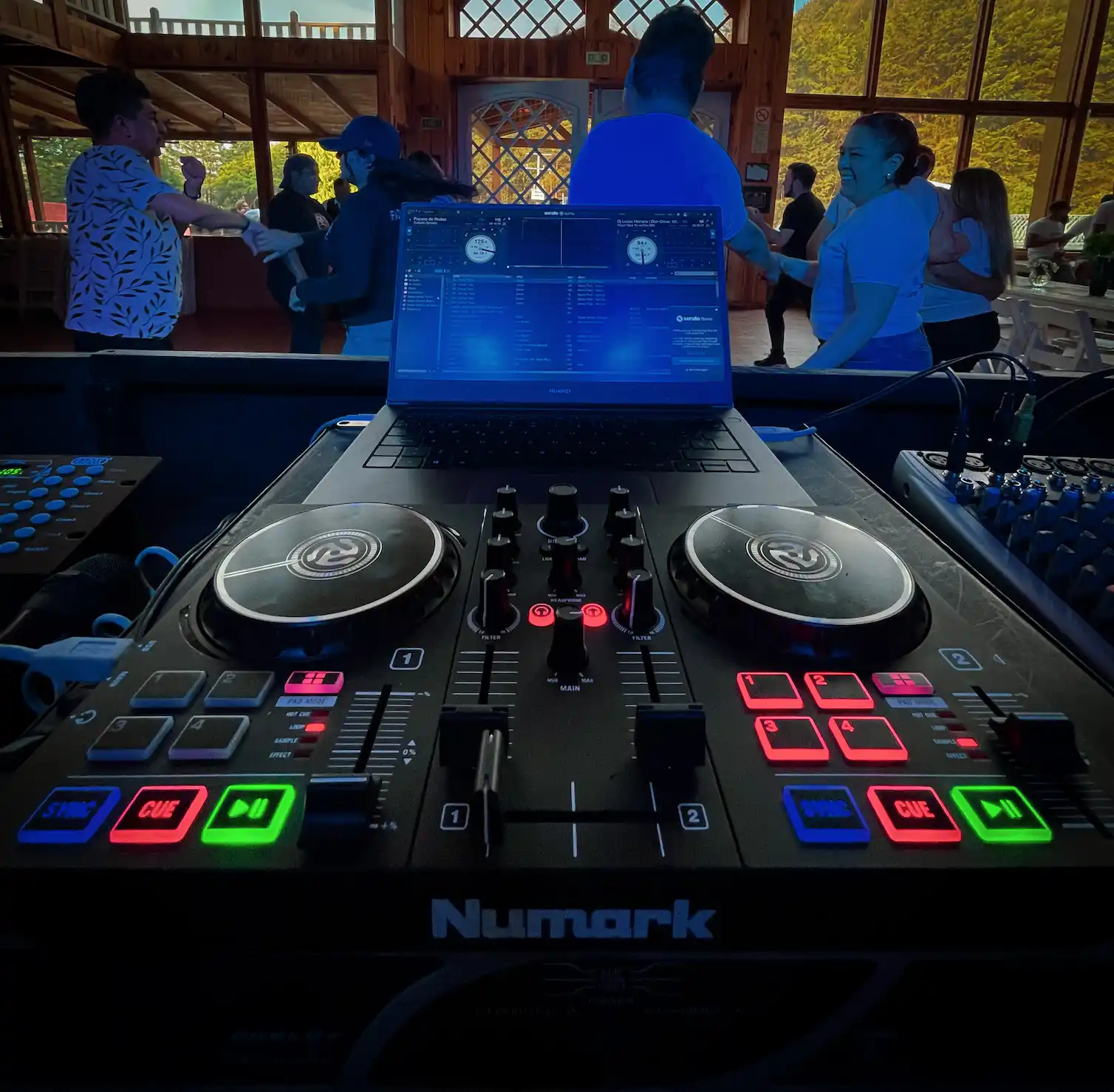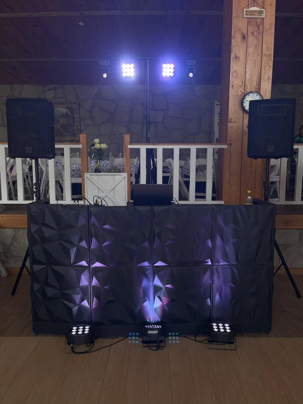 Dj controller on stage for discotheque in empty nightclub with no people. Electronic musician console equipment, loudspeakers and spotlights for live music concert in dark club.