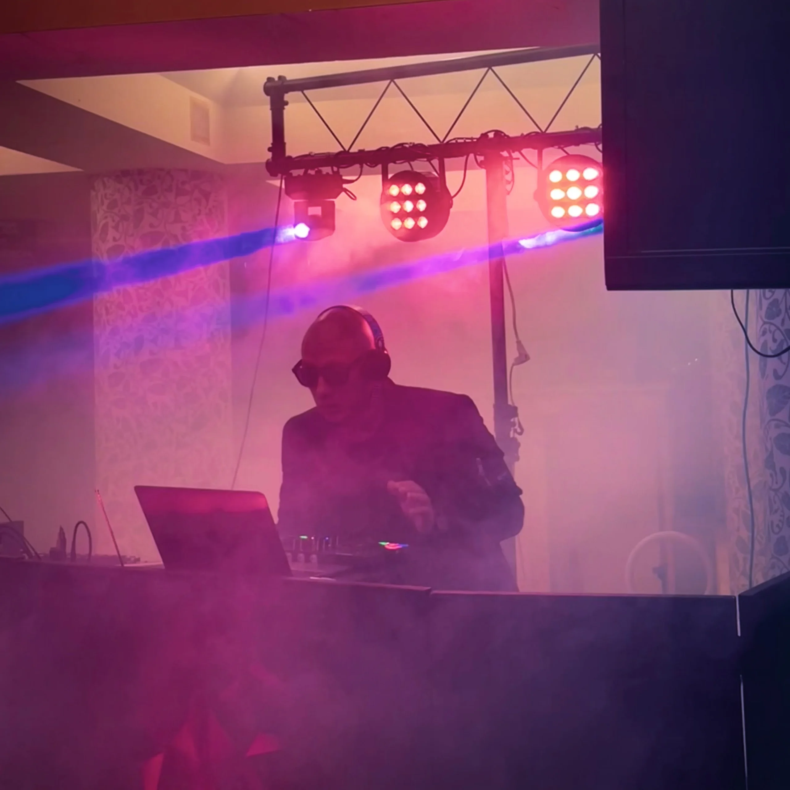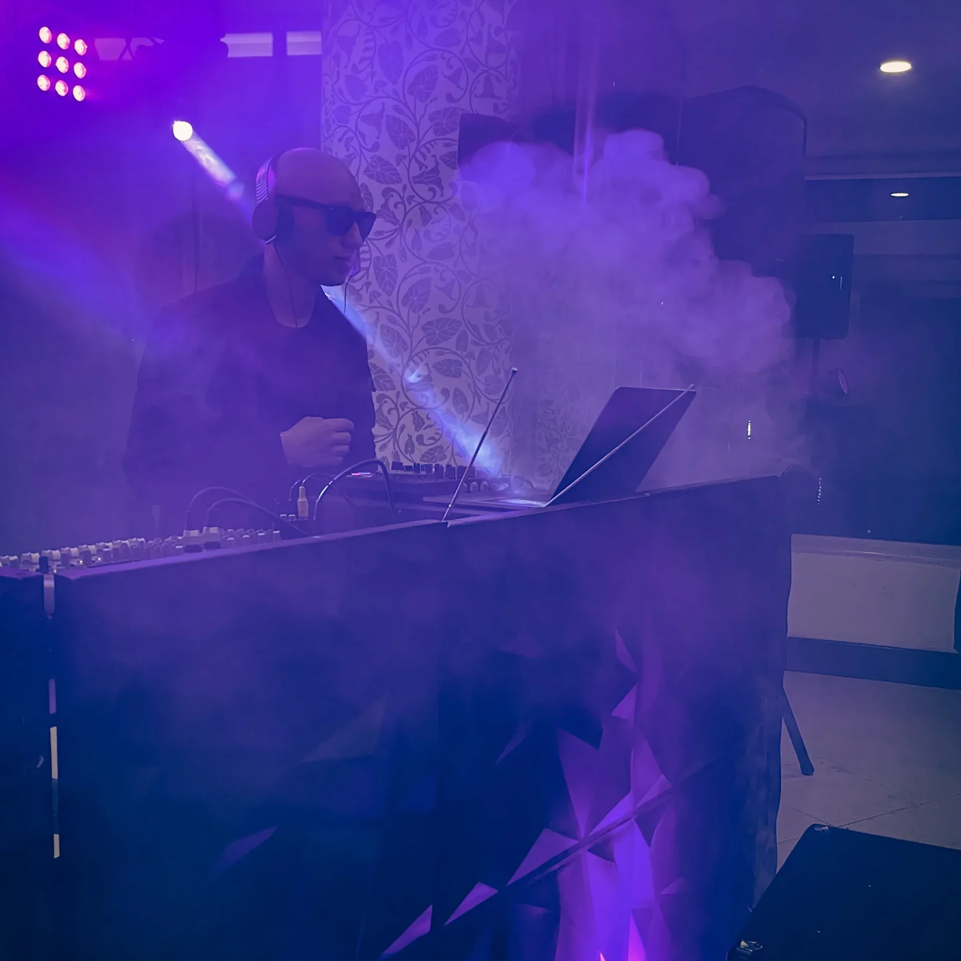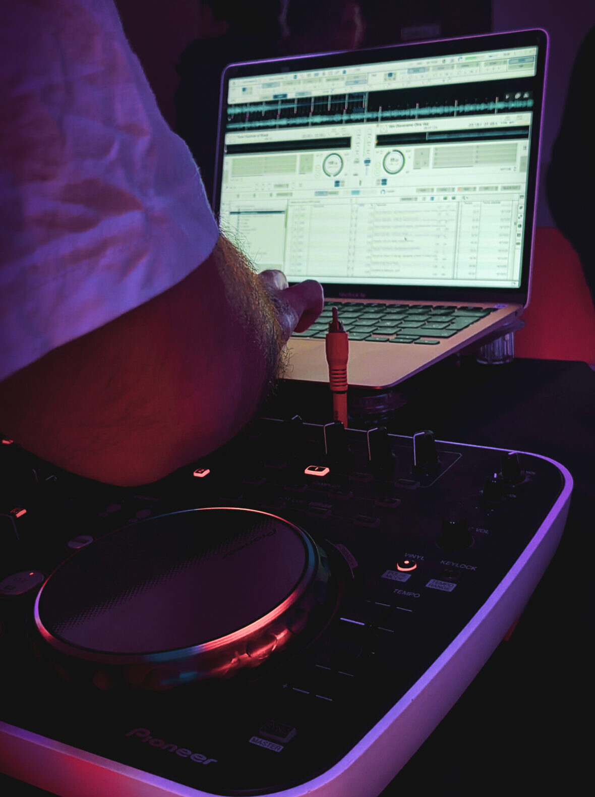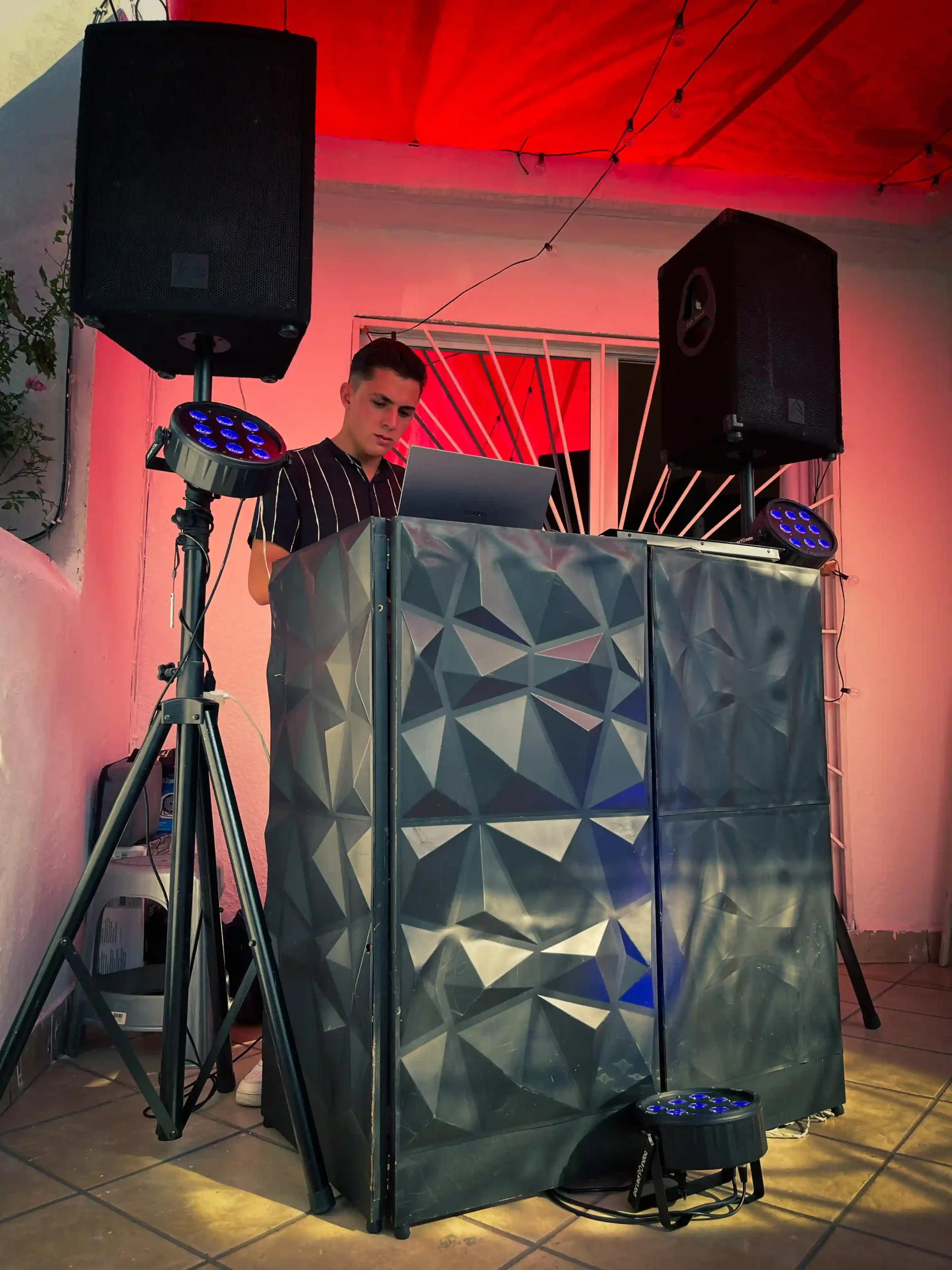 Dj controller on stage for discotheque in empty nightclub with no people. Electronic musician console equipment, loudspeakers and spotlights for live music concert in dark club.