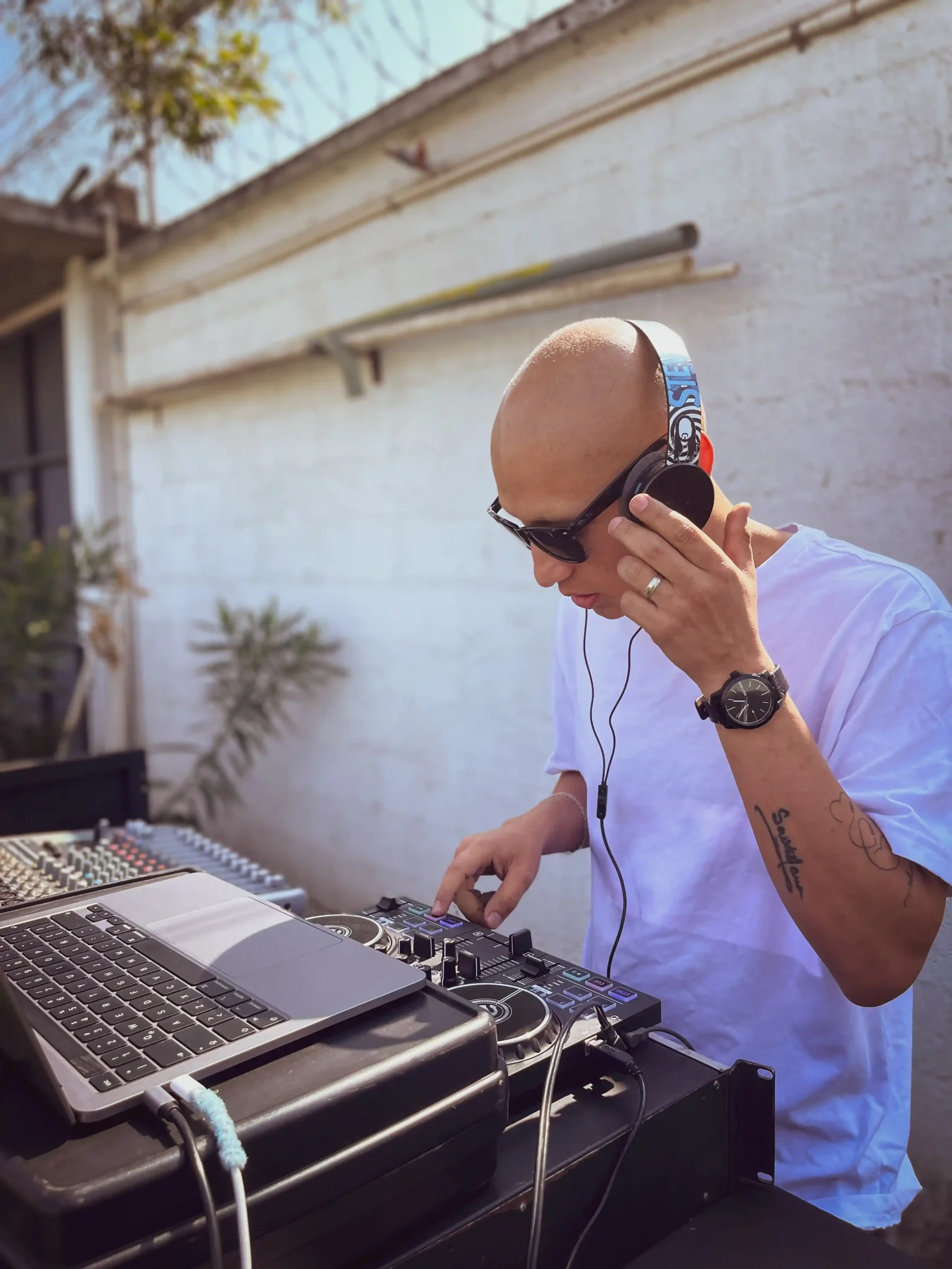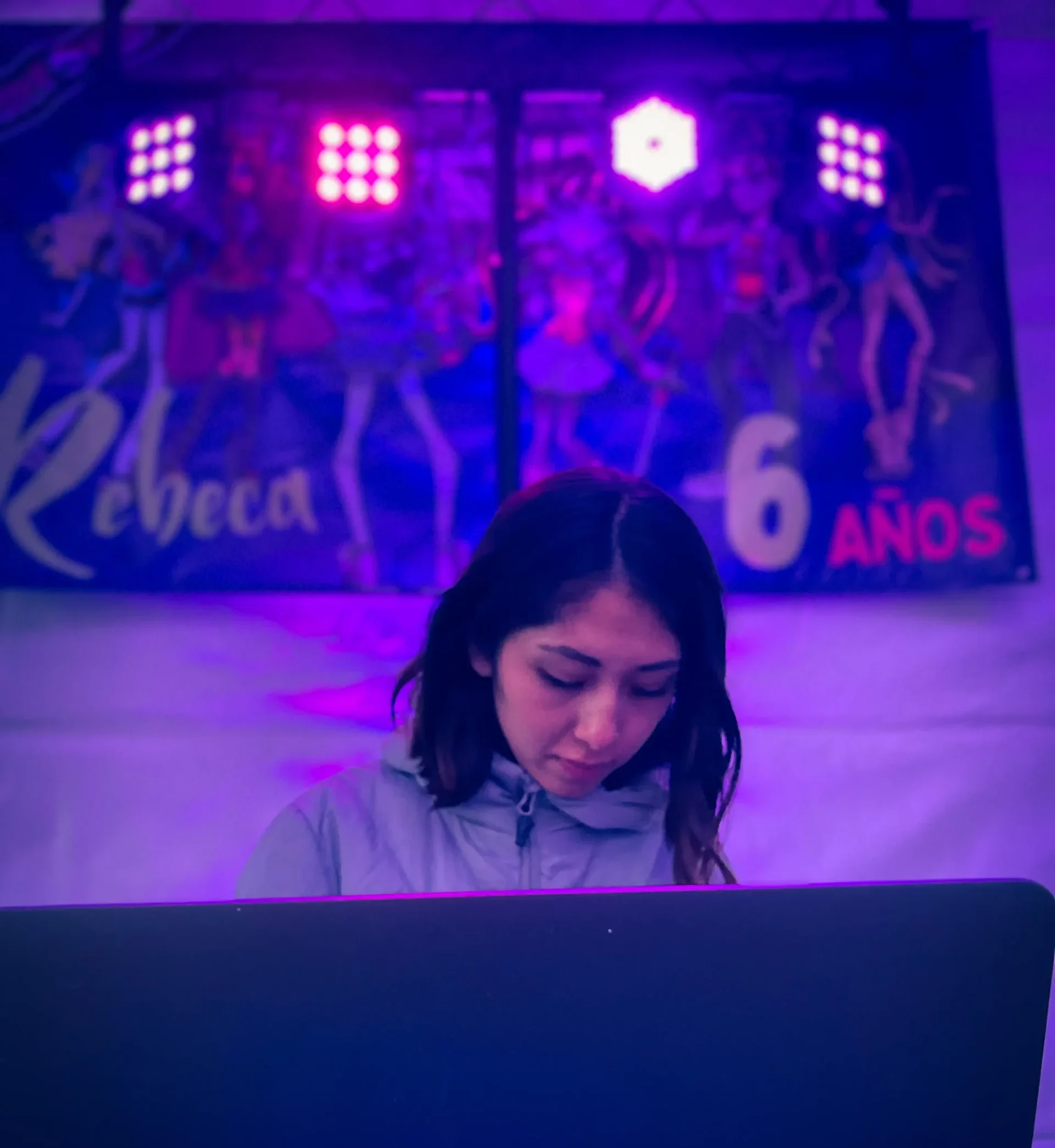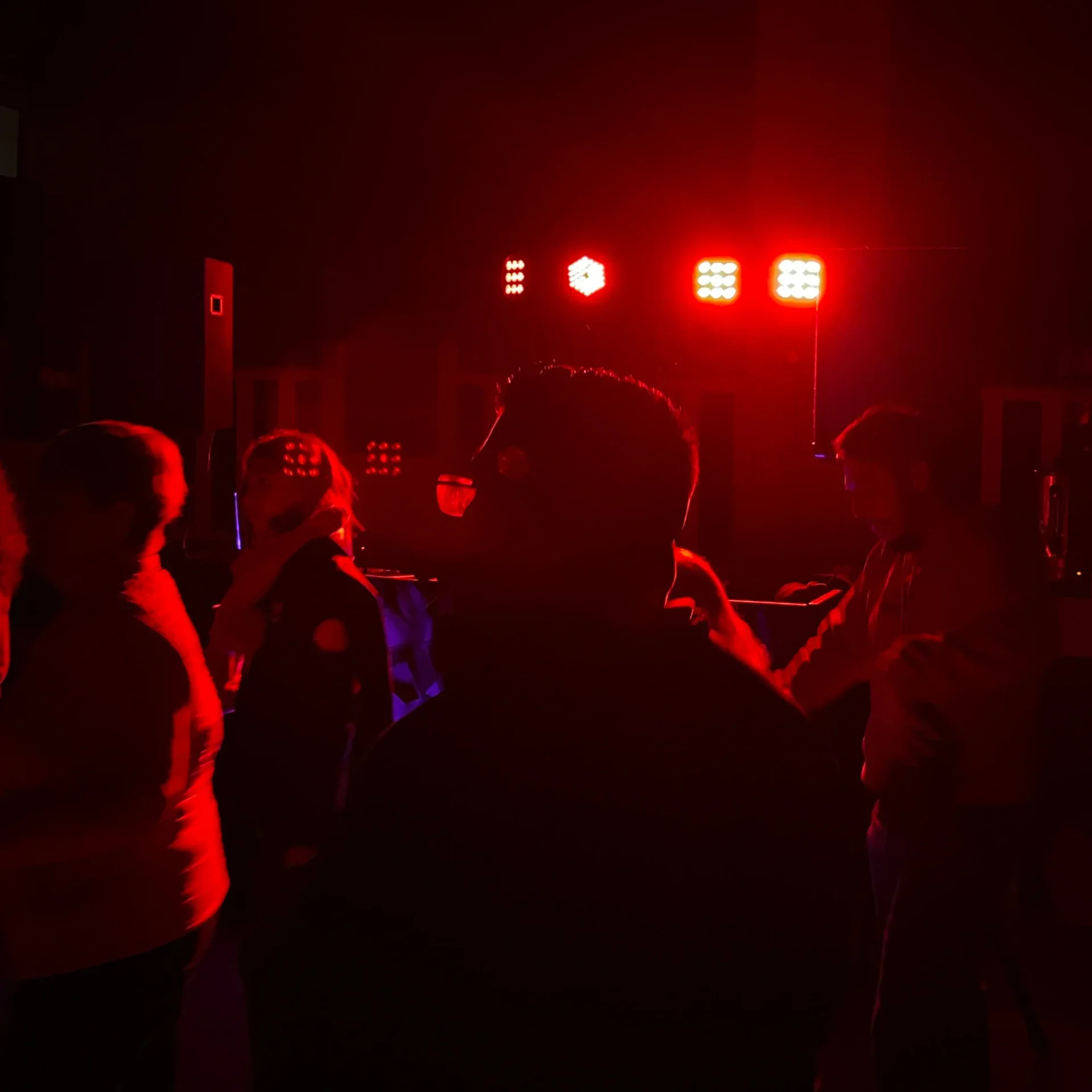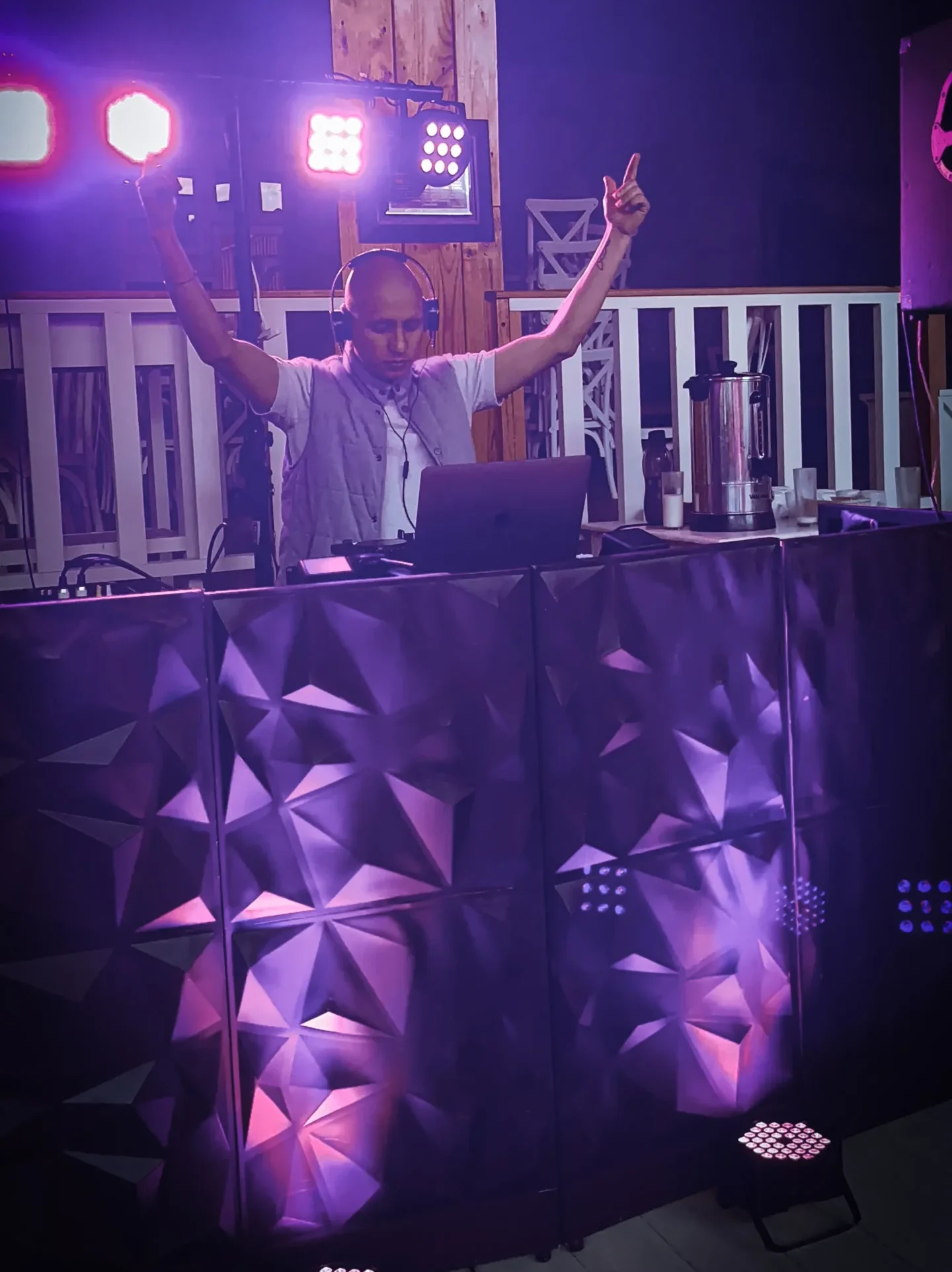 Dj controller on stage for discotheque in empty nightclub with no people. Electronic musician console equipment, loudspeakers and spotlights for live music concert in dark club.